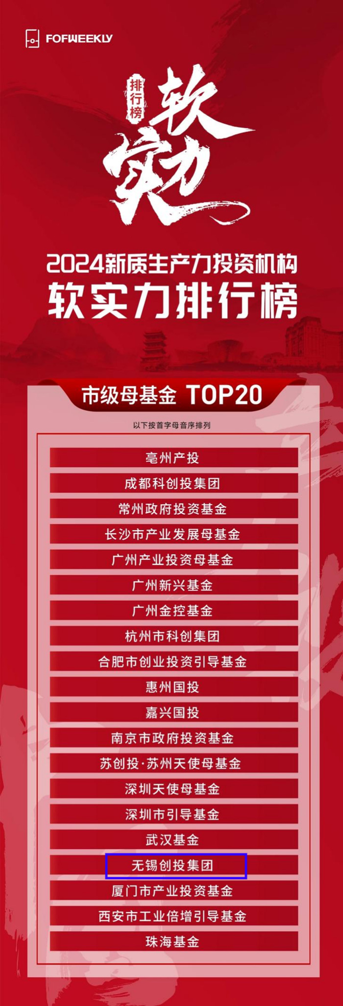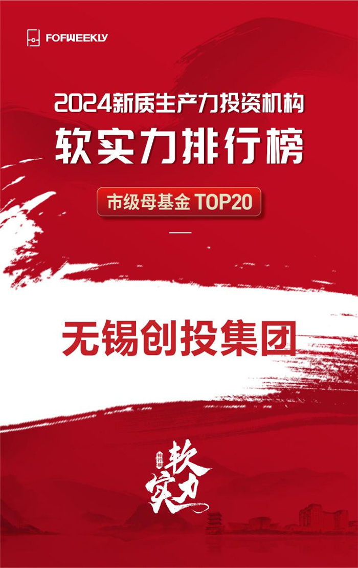 近日,《母基金周刊》(FOFWEEKLY)公布其年度排名“2024新質(zhì)生產(chǎn)力投資機(jī)構(gòu)軟實(shí)力排行榜”,無錫創(chuàng)投集團(tuán)榮登“2024新質(zhì)生產(chǎn)力投資機(jī)構(gòu)軟實(shí)力排行榜—市級母基金 TOP20”。