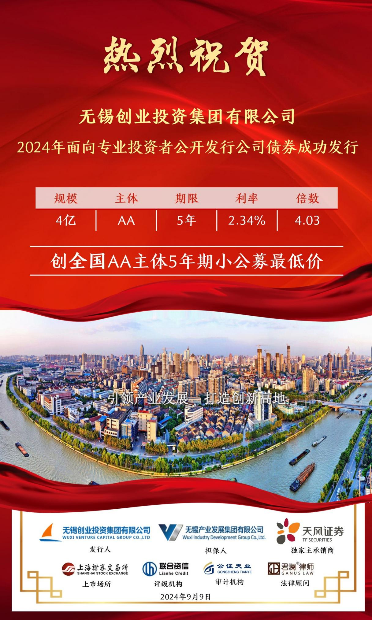 9月9日,無錫創(chuàng)業(yè)投資集團(tuán)有限公司(簡稱“無錫創(chuàng)投集團(tuán)”)2024年面向?qū)I(yè)投資者公開發(fā)行公司債券“24錫創(chuàng)01”成功發(fā)行,發(fā)行規(guī)模4億元,發(fā)行期限5年,認(rèn)購倍數(shù)4.03倍,票面利率2.34%,創(chuàng)全國可比債券歷史發(fā)行最低利率!本期債券由天風(fēng)證券承銷,主體評級AA,債項(xiàng)評級AAA。 無錫創(chuàng)投集團(tuán)作為無錫產(chǎn)業(yè)集團(tuán)旗下的創(chuàng)業(yè)投資和股權(quán)投資平臺,近年來在集團(tuán)的正確領(lǐng)導(dǎo)和大力支持下,圍繞無錫“465”現(xiàn)代化產(chǎn)業(yè)集群建設(shè),聚焦產(chǎn)業(yè)集團(tuán)“1+4+X”產(chǎn)業(yè)布局,持續(xù)深化產(chǎn)融協(xié)同合作,不斷提升資金使用效率,努力為公司高質(zhì)量發(fā)展提供更低成本、更長周期、更加靈活的資金支持。未來,公司將繼續(xù)承擔(dān)國企社會責(zé)任,勇挑重?fù)?dān),發(fā)揮自身優(yōu)勢,持續(xù)為無錫新質(zhì)生產(chǎn)力和實(shí)體經(jīng)濟(jì)高質(zhì)量發(fā)展注入新活力、增添新動(dòng)能。 |
