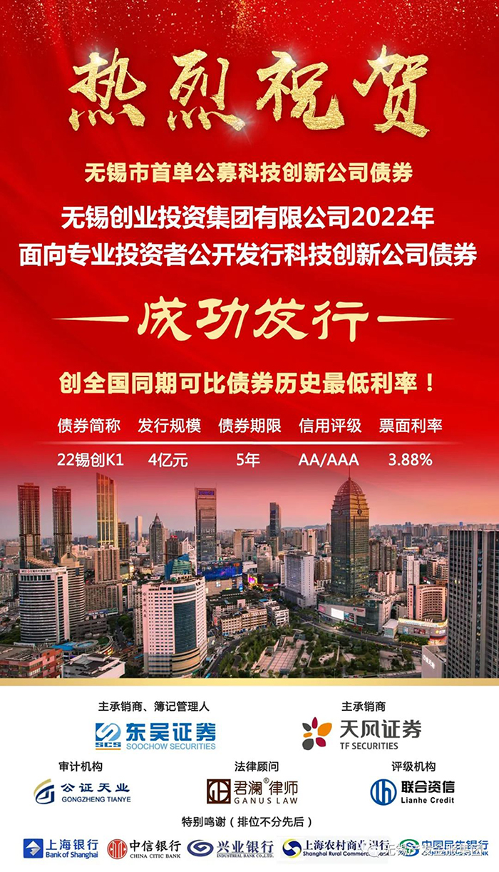 | 無錫創(chuàng)投集團(tuán)成功發(fā)行無錫市首單公募科技創(chuàng)新公司債券 |